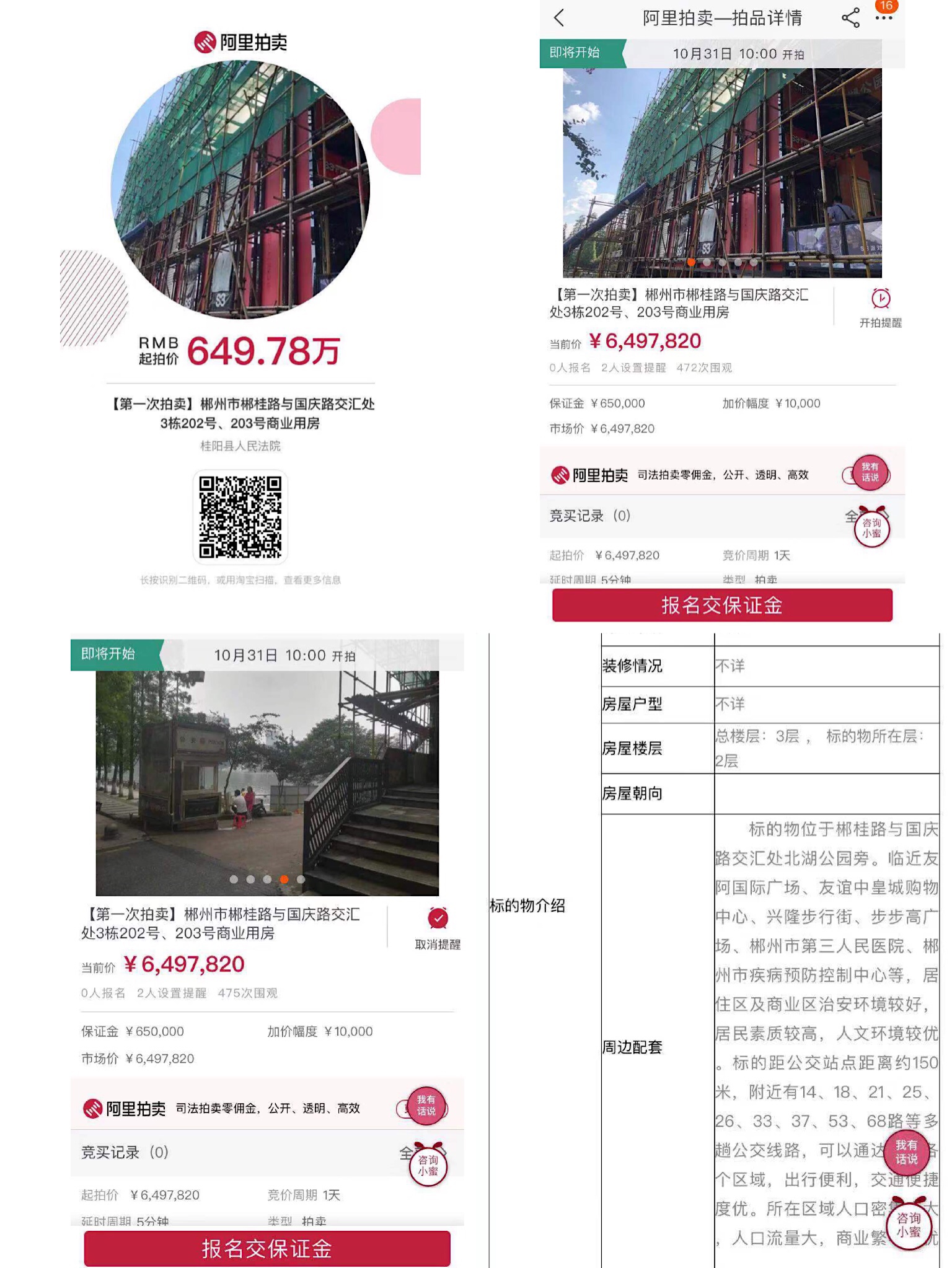 郴州市郴桂路与北湖路交汇处3栋202、203号商业用房于2019年10月31日开拍。本次是由桂阳县人民法院在淘宝网上挂网拍卖,所拍卖的房源是位于郴州市北湖公园旁,原88酒吧、S2酒吧商业用房,建筑面积464.13平方米,房屋结构合理,周边环境优美,配套设施齐全,道路通畅,交通方便。起拍价649.78万元,单价仅13999元/平方米,带租约出售。欢迎大家参与竞拍!来电咨询热线:0735-2491896、18673500907。